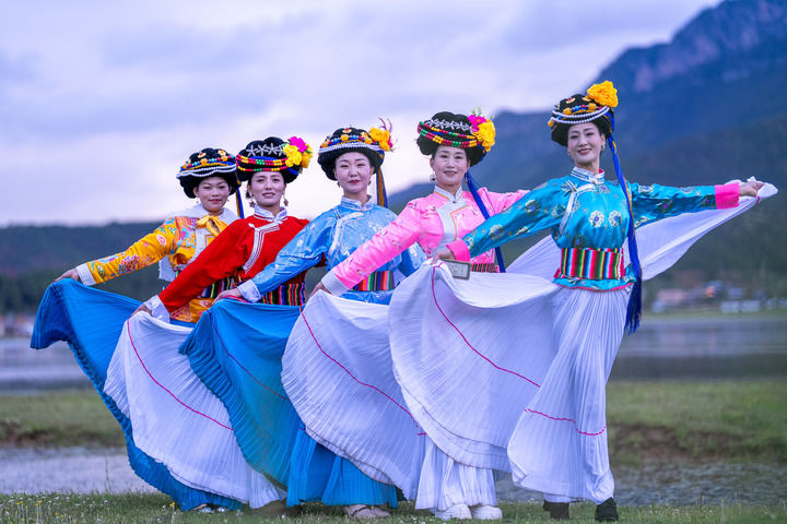 7月3日,寧蒗縣各族群眾展示民族服飾。